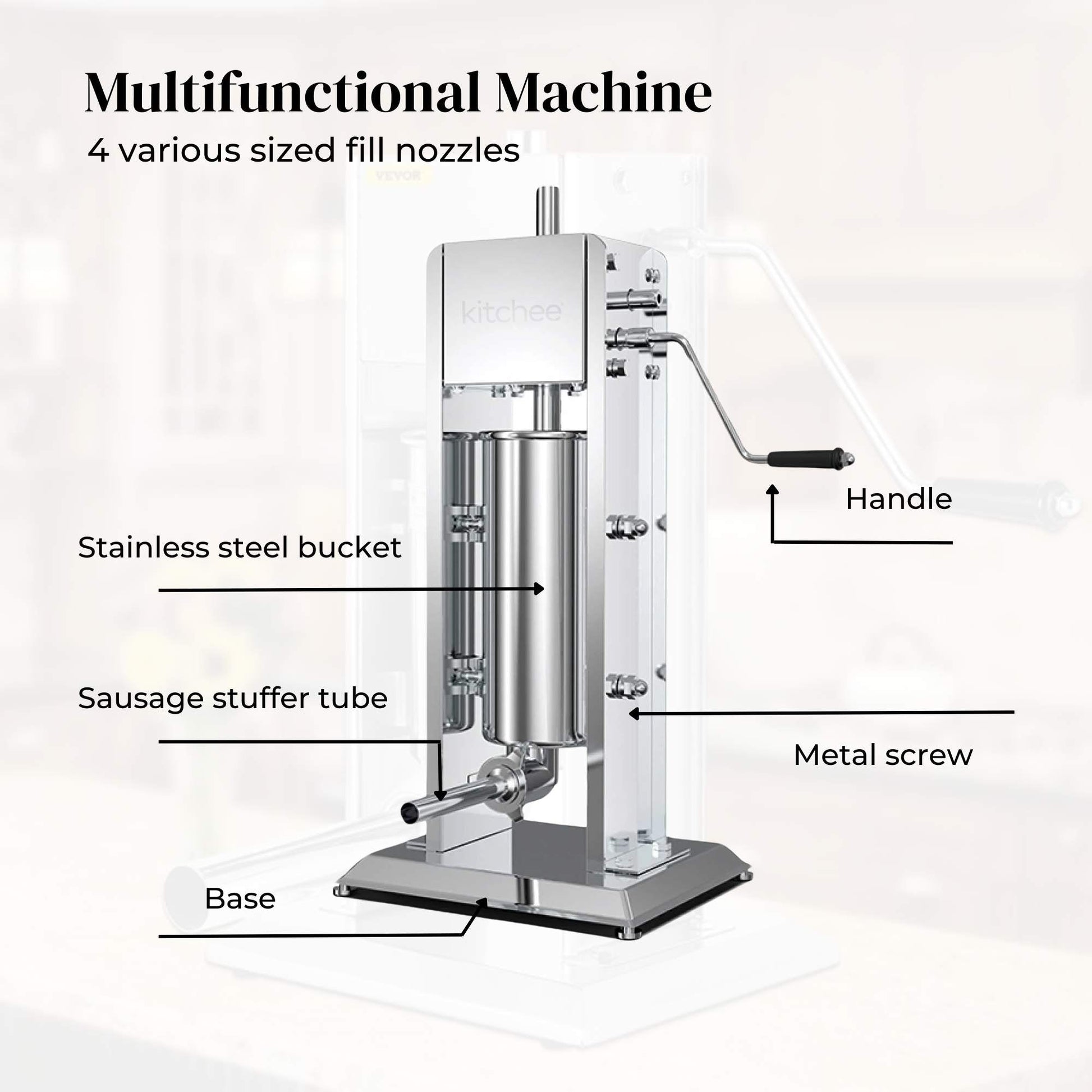 This sturdy 5L Manual Vertical Sausage Stuffer Machine is designed to be mounted securely onto any surface. The tank and various sized filling nozzles are made of a high grade, food safe 304 stainless steel for quality and durability.