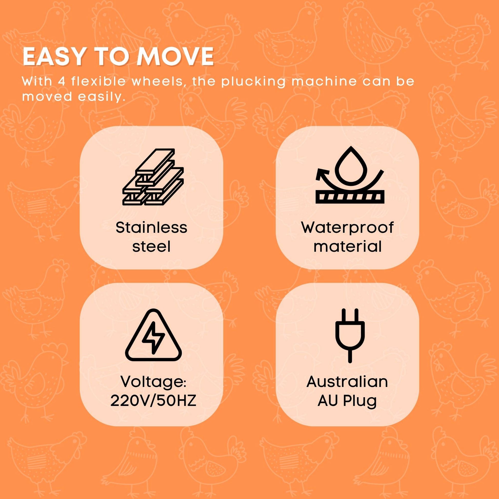 This efficient plucker is designed with four wheels for effortless mobility. With a garden hose attachment and a quick start-up, you can have freshly plucked chickens in under sixty seconds.